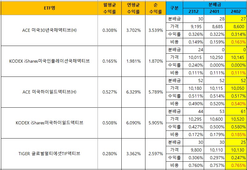 | [국내월배당ETF] 24년 1월 비용 정리 (& 수익률순위) (0) | 2024.02.13 |