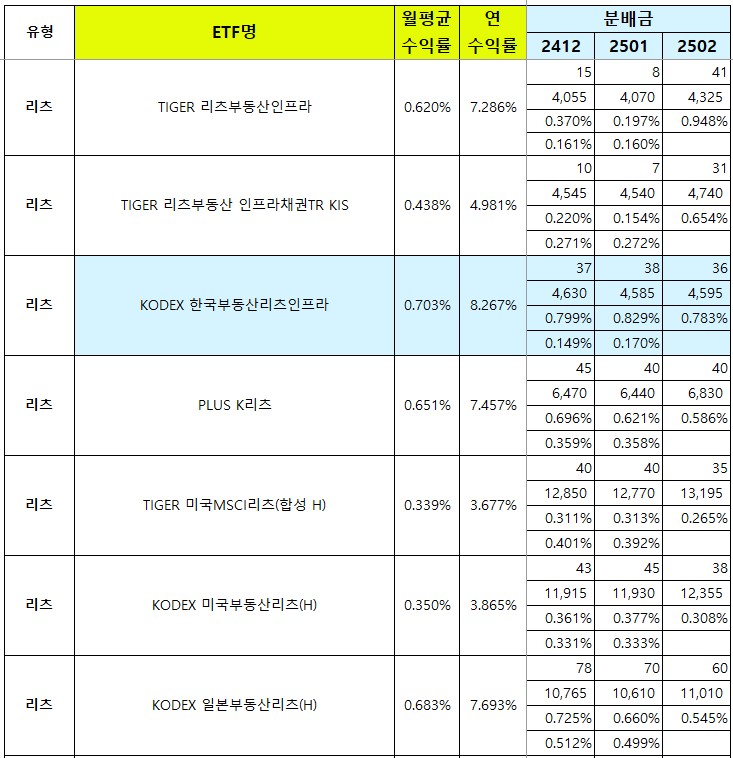- 수익률 : 매월 분배금을 가격으로 나눈 값