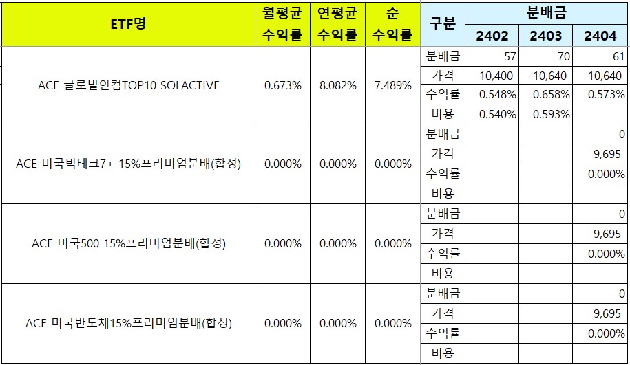 . ACE글로벌인컴TOP10 SOLACTIVE는 미국 채권 커버드콜, 러셀2000 커버드콜 등 다양한 커버드콜 종목이 섞인 종목으로 월평균 0.6% 정도의 분배금이 지급되고 있어요.