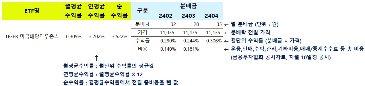 . ACE / SOL / TIGER 미국배당다우존스 4월 분배수익률에선 SOL이 가장 높은 0.315% 이고 ACE가 가장 낮은 0.277%를 기록했어요.