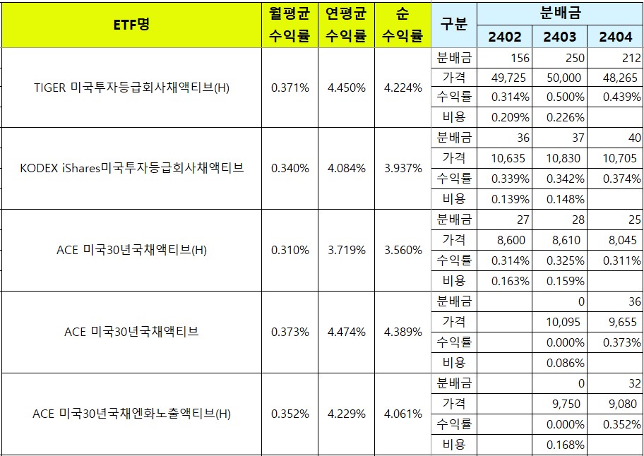 . 국내 채권에 투자하는 ETF들로 연수익률은 대략 2.5~4% 수준이에요.
