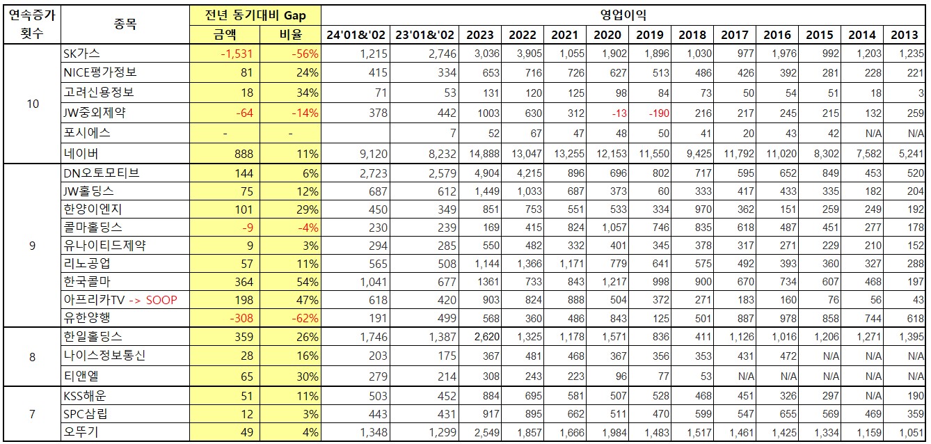 . 24년 1분기, 2분기 실적 확인 시 적자인 종목은 한 개도 없었어요. 적자가 아닌건 알겠는데, 이게 또 감소 추세에 있으면 안 좋은거잖아요. 그래서 23년 1, 2분기 합산한 실적과 24년 1, 2분기 합산한 실적을 비교를 해봤어요. 전체 21개 종목 중에 4개 종목이 전년 동기 대비 영업이익이 감소된 것으로 확인돼요. SK가스는 전년 동기 대비 영업이익이 50% 넘게 감소했고, 유한양행도 62%나 감소했어요. 그리고 JW중외제약 14%, 콜마홀딩스 4% 감소를 한걸로 확인되네요. 포시에스를 제외하고 총 16개 기업의 1, 2분기 영업이익이 전년 동기 대비 좋아진 것을 확인할 수 있어요. 특히 한국콜마는 54%, SOOP는 47%나 좋아졌네요.