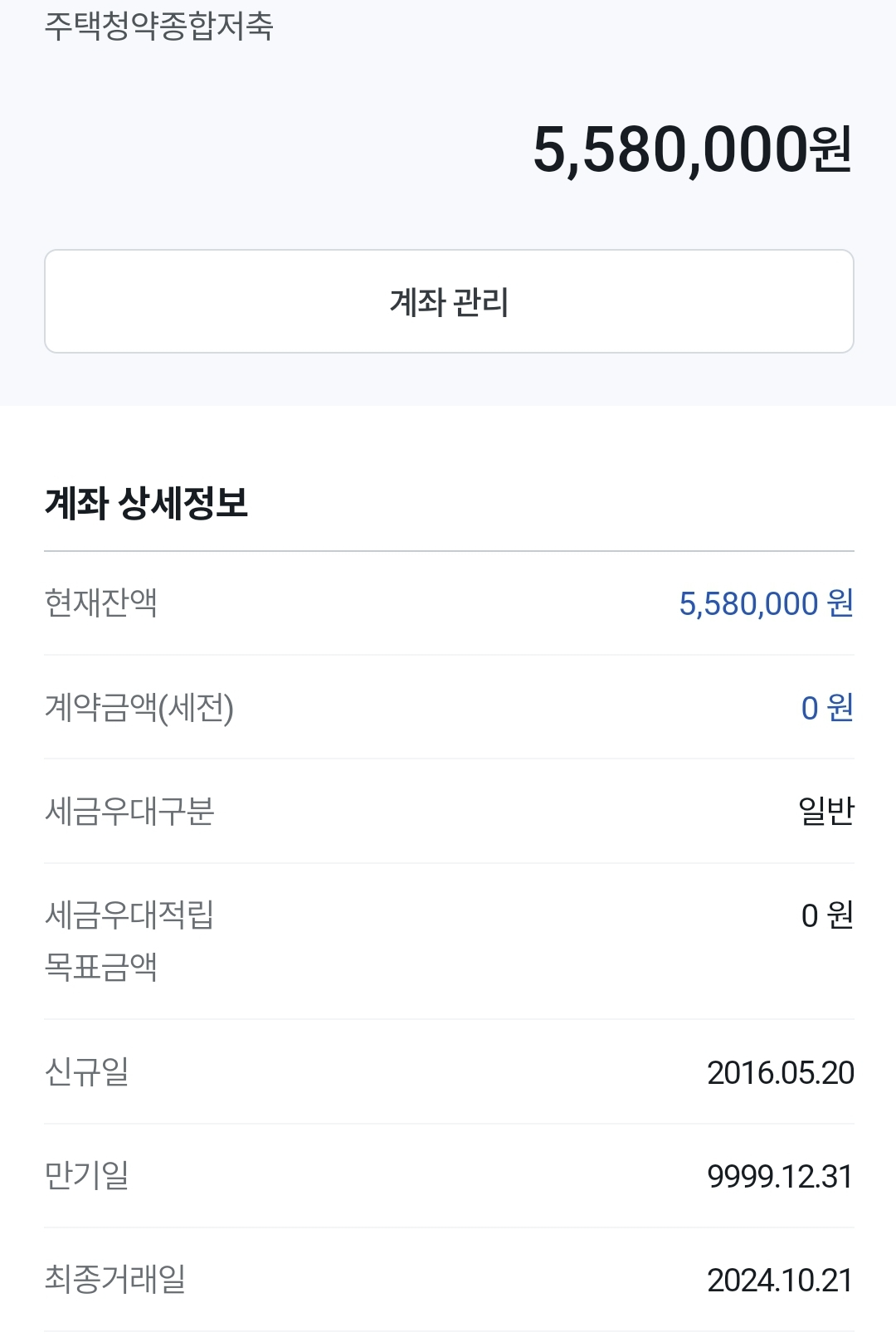 - 주택청약종합저축을 2016년 5월부터 납입하여 총 558만원이 들어있는 계좌가 있어요.