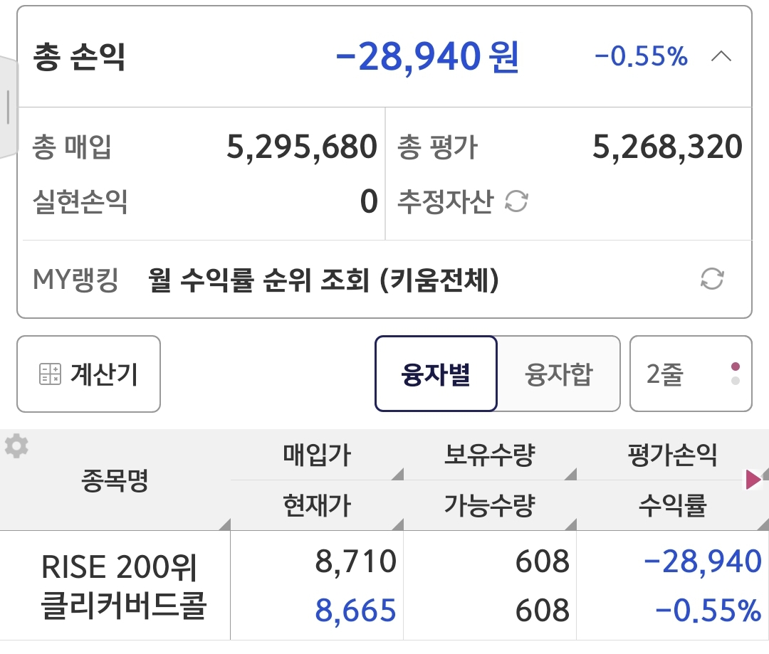 - 바로 입금된 530만원을 키움증권으로 이체를 해서 RISE 200위클리커버드콜 608주를 8710원에 매수했어요. (그런데 그새 또 떨어졌네요...)