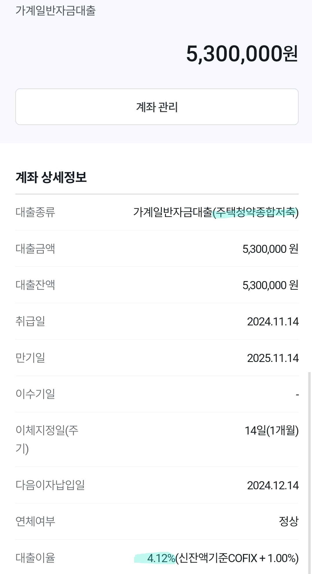 - 그래서 예적금담보대출로 530만원을 4.12%의 이율로 대출을 실행했어요.