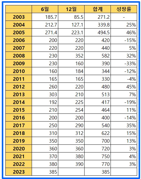 - 2003년부터 2023년 상반기까지 일 년에 두 번씩 꾸준히 배당금을 지급해왔어요.