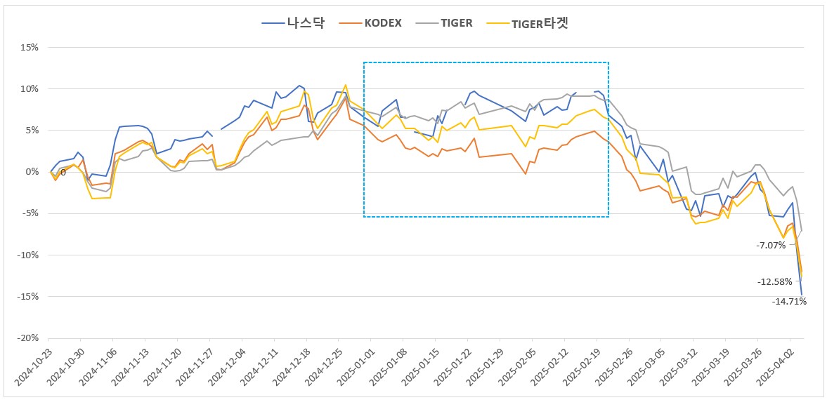 - 0%에서 시작하여 25년 4월 2일 기준으로 나스닥 14.7% 하락, KODEX 11.94% 하락, TIGER 7.07% 하락, TIGER 타겟 12.58% 하락