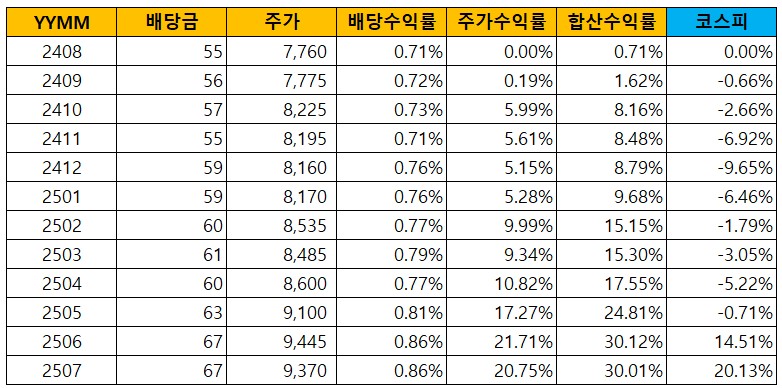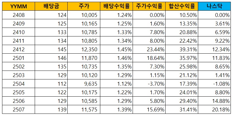 24년 8월부터 25년 7월까지 주가수익률만 비교를 하면 커버드콜ETF는 15.69% 오른 반면 나스닥은 20.18%를 상승했기 때문에 커버드콜 ETF가 상승세를 못 따라간건 맞지만, 같은 기간 동안 배당을 받은게 있잖아요. 더욱이 상승 시점에서 배당을 꾸준히 재투자를 했다면 합산수익률 격차는 더 벌어졌을거에요.