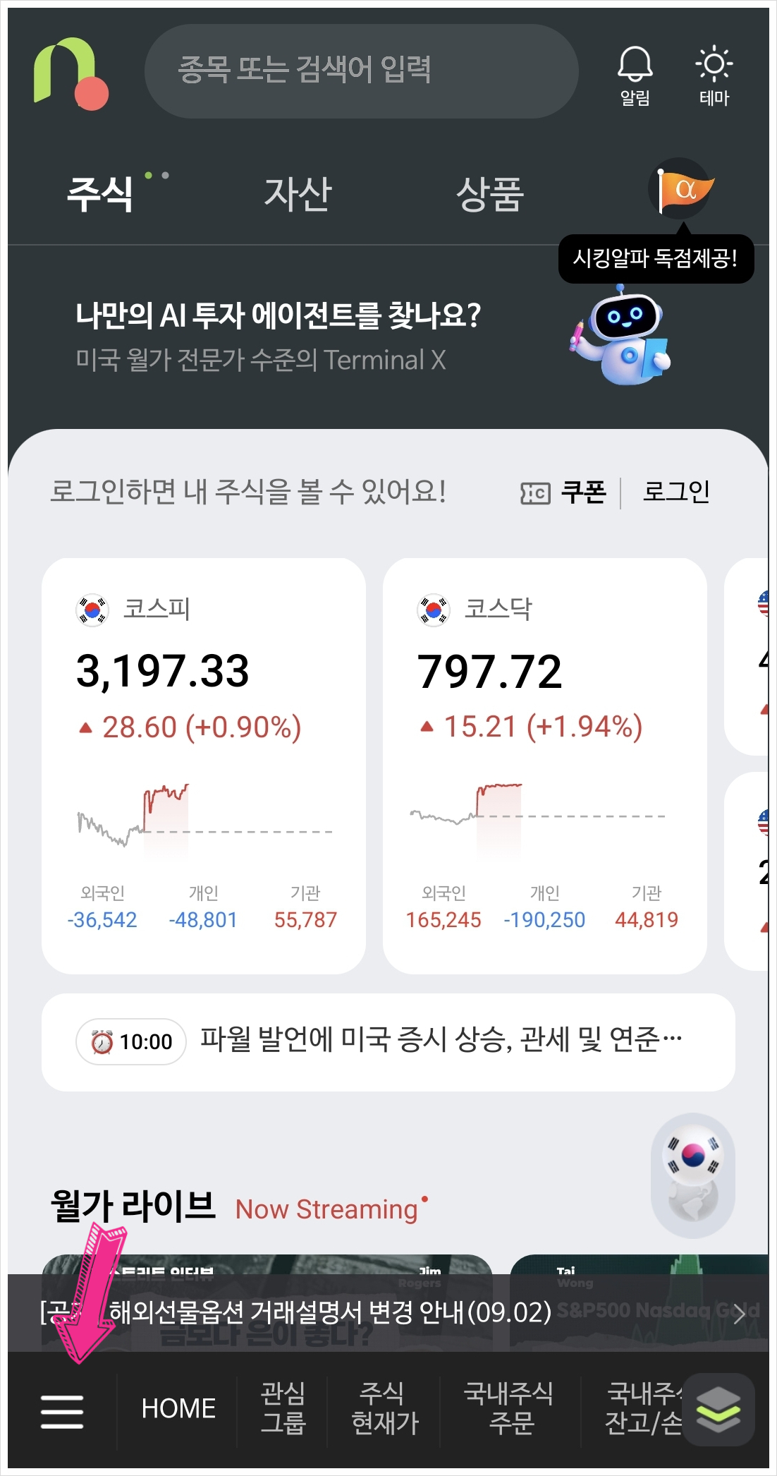 - 나무증권 앱 실행 후 왼쪽 밑에 三 자를 클릭해요.