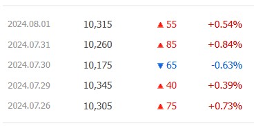 위에서 보시는 것처럼 7월 29일, 30일 사이의 이상한 가격 움직임 때문이에요. 29일날 종가가 10345원이었고, 30일은 전일 대비 65원이 하락했다면 30일의 종가가 10345원에서 65원을 뺀 10280원이 되어야 하는데 그보다 105원이나 더 빠진 10175원이 종가로 되어 있어요. 7월 분배금이 106원인데 그에 해당되는만큼 배당락이 발생해서 그래요. 이건 커버드콜 종목이라서 그런게 아니라 월배당을 지급하는 종목은 모두 그런걸로 확인이 돼요.