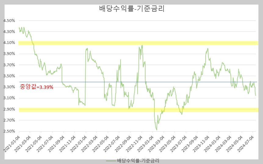 위의 <표5>의 배당수익률에서 기준금리를 뺀 값의 Y축 값을 확대한 그래프에 중앙선을 그어봤어요. 중앙 값(median값)은 3.39%에요. 이를 역산해보면, 현재 기준금리가 3.5%이니 배당수익률이 6.89%가 되는 값이고, 배당금이 311원(2023년의 배당금)인데 배당수익률이 6.89%이므로 주가는 4514원이라는 값이 나와요. 즉, 현재의 기준금리에서 4515원보다 주가가 높으면 기대 배당수익률 대비 주가가 더 올랐다는 거고, 4515원보다 낮으면 기대 배당수익률 대비 주가가 떨어졌다는 의미가 돼요.