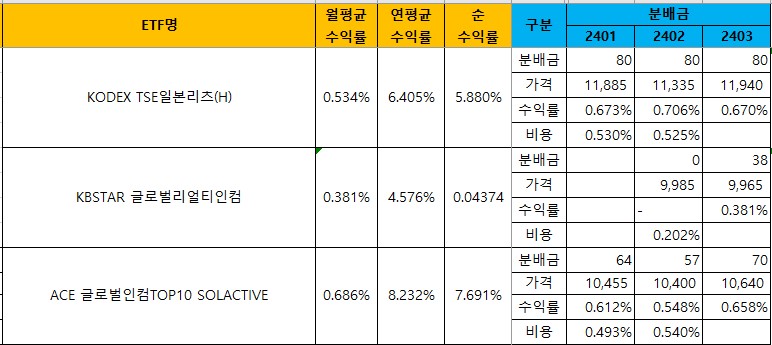 | [국내월배당ETF] 24년 1월 비용 정리 (& 수익률순위) (0) | 2024.02.13 |