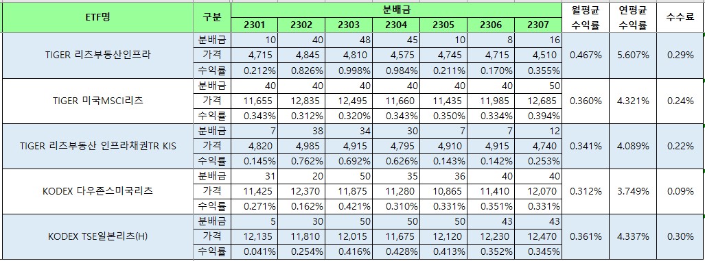 - 개인적으로 제가 투자하고 있는 월배당ETF는 TIGER 리츠부동산인프라인데요,