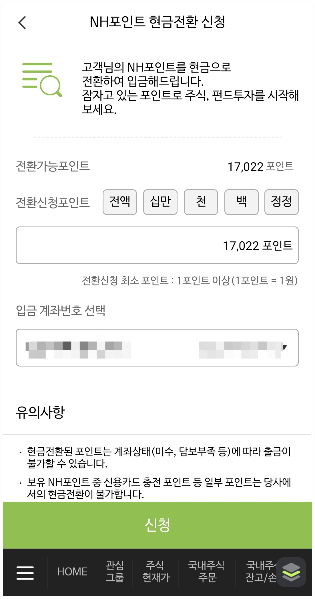 - 그러면 바로 "전환가능포인트" 하고 나오고, 밑에 '입금 계좌번호 선택"에서 나무증권에 개설되어 있는 계좌번호 리스트가 나오는데요, 계좌를 선택하고 "신청"을 눌러요.