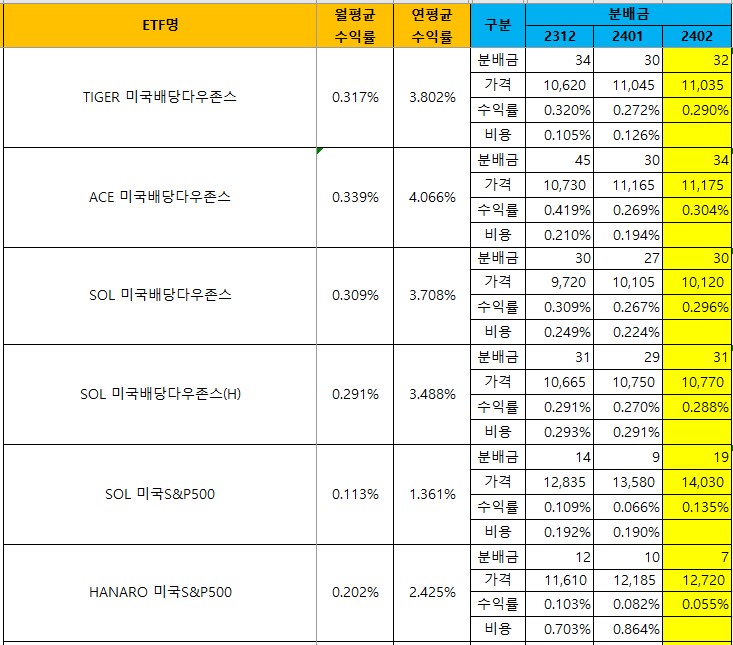 - KODEX는 월별로 주가 대비 1.5%가 넘는 배당수익률이고, TIGER는 1%, TIGER타겟은 1.3% 정도 되네요.