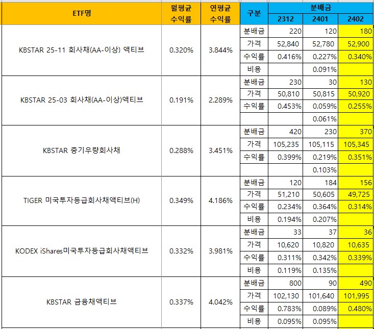 - 위의 표는 종목별 매월 1주당 배당금 발생 현황이에요.